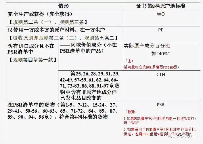 当产品属于非完全生产或获得时,证书上第8栏原产地标准应显示"PSR"、"区域价值成分百分比"或"CTH"。
