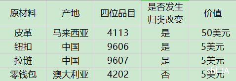 判定:根据《议定书》附件1《原产地规则》的要求,零钱包是唯一不符合税目归类改变的非原产成分。零钱包的价值占了货物FOB价值的5%。由于符合微小含量规则,即非原产成分的价值不超过该货品FOB价值的10%,所以该手袋符合中国-东盟自贸区原产货物的定义,应取得原产资格。