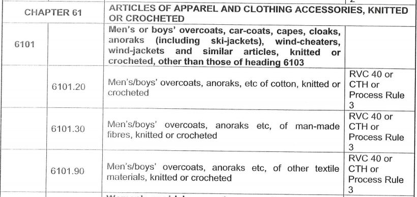 61和62章服装产品既列入了《产品特定规则》(PSR)清单;又列入了一般规则的CTH清单,即第4条第1(b)款。PSR清单和CTH清单重合部分共涉及232项6位子目的产品,主要就是在服装产品这两章里。