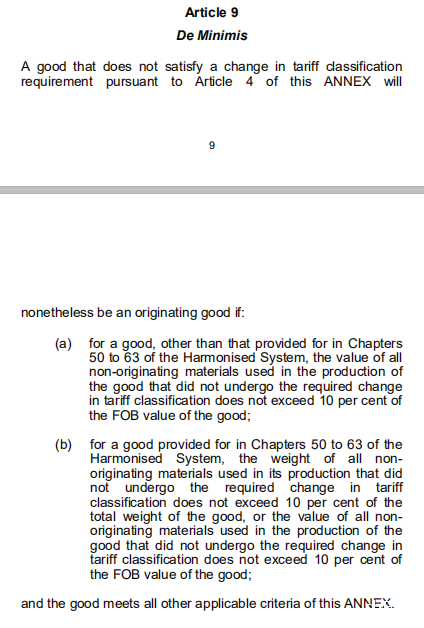 修订后《原产地规则》第9条(Article9)加入了“微小含量”规则。