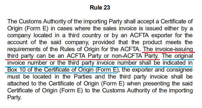6.出口至东盟成员国的货物在进口国海关报关时如使用第三方发票,应在本栏目空白处注明开具发票的公司名称及所在国家等信息,例如"THE THIRD PART:ALTEAD CO.LTD,HONGKONG"。第三方必须为中国以外的第三方公司,不得为国内公司。