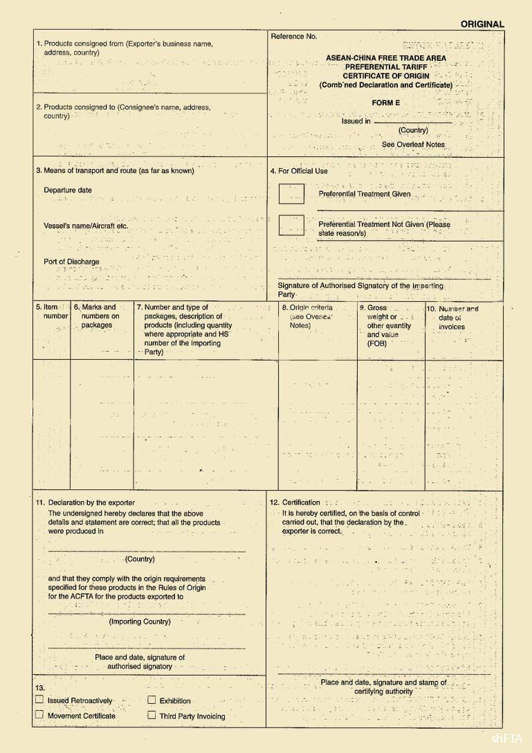 中国一东盟自由贸易区优惠原产地证明书(以下简称 FORM E证书)共有13栏,各栏填制要求如下:
