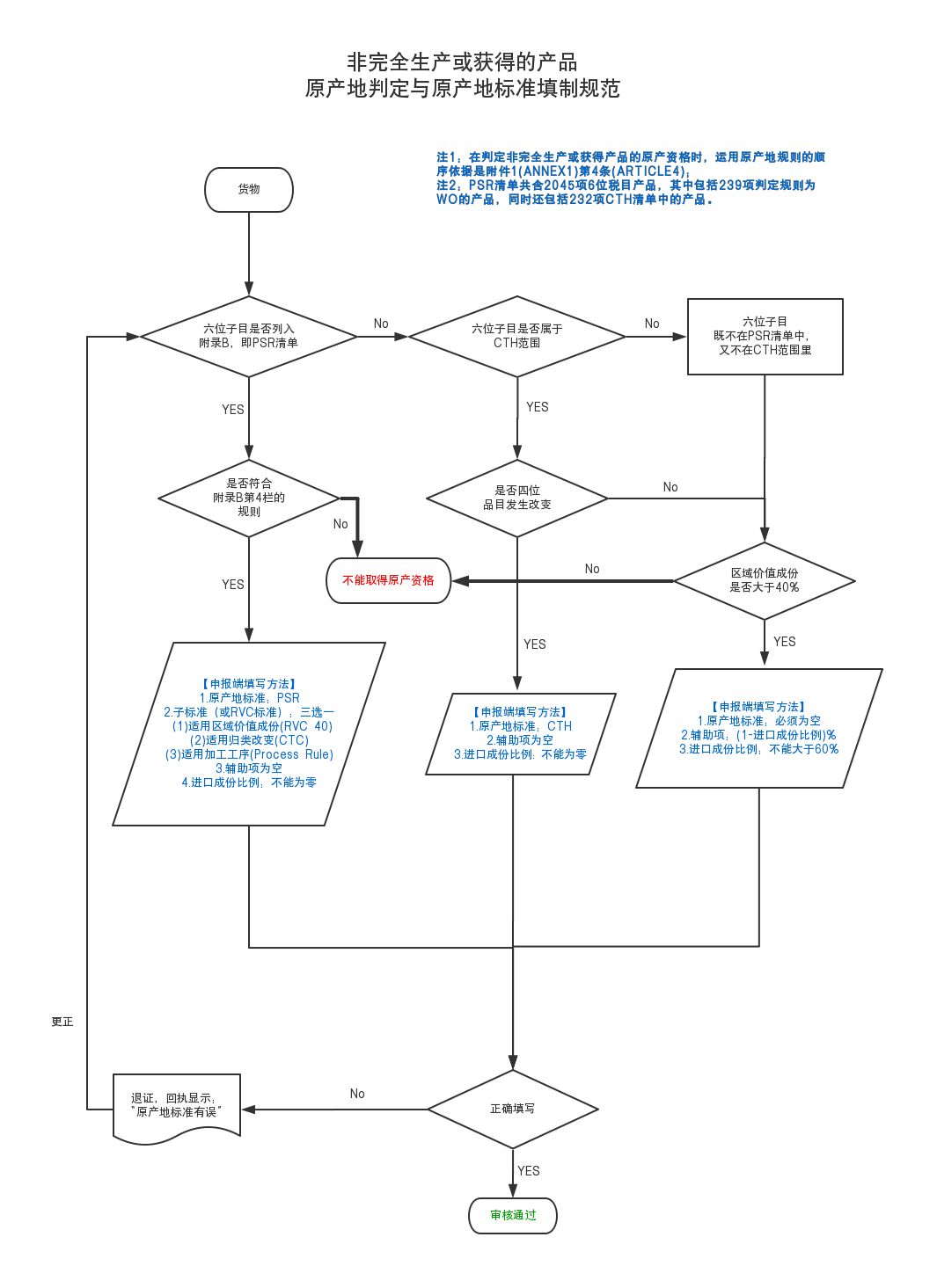 二、如果产品不符合完全生产或获得的定义,必须先按原产地规则中设定的“微小加工”或“不充分加工”条款(否定性标准),确定该产品所含非原产成分所经过的加工是否超出微小或不充分加工的范围,如果未超出,产品不具有原产资格;如果超出,再确定产品是否被列入《产品特定规则》 所涉及产品的清单,如果是,确定其是否符合相应的特定原产地规则(区域价值成分不少于40%、税则归类改变或加工工序规则),如果符合,产品具有原产资格;如果产品未列入《产品特定规则》清单,才应按照一般规则来确定产品的原产资格。