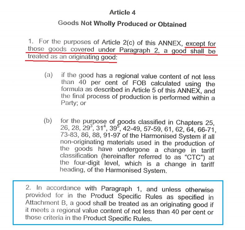 《议定书》附件1(ANNEX1)《原产地规则》第4条(Article4)对非完全生产或获得产品制定了新的判定规则:
